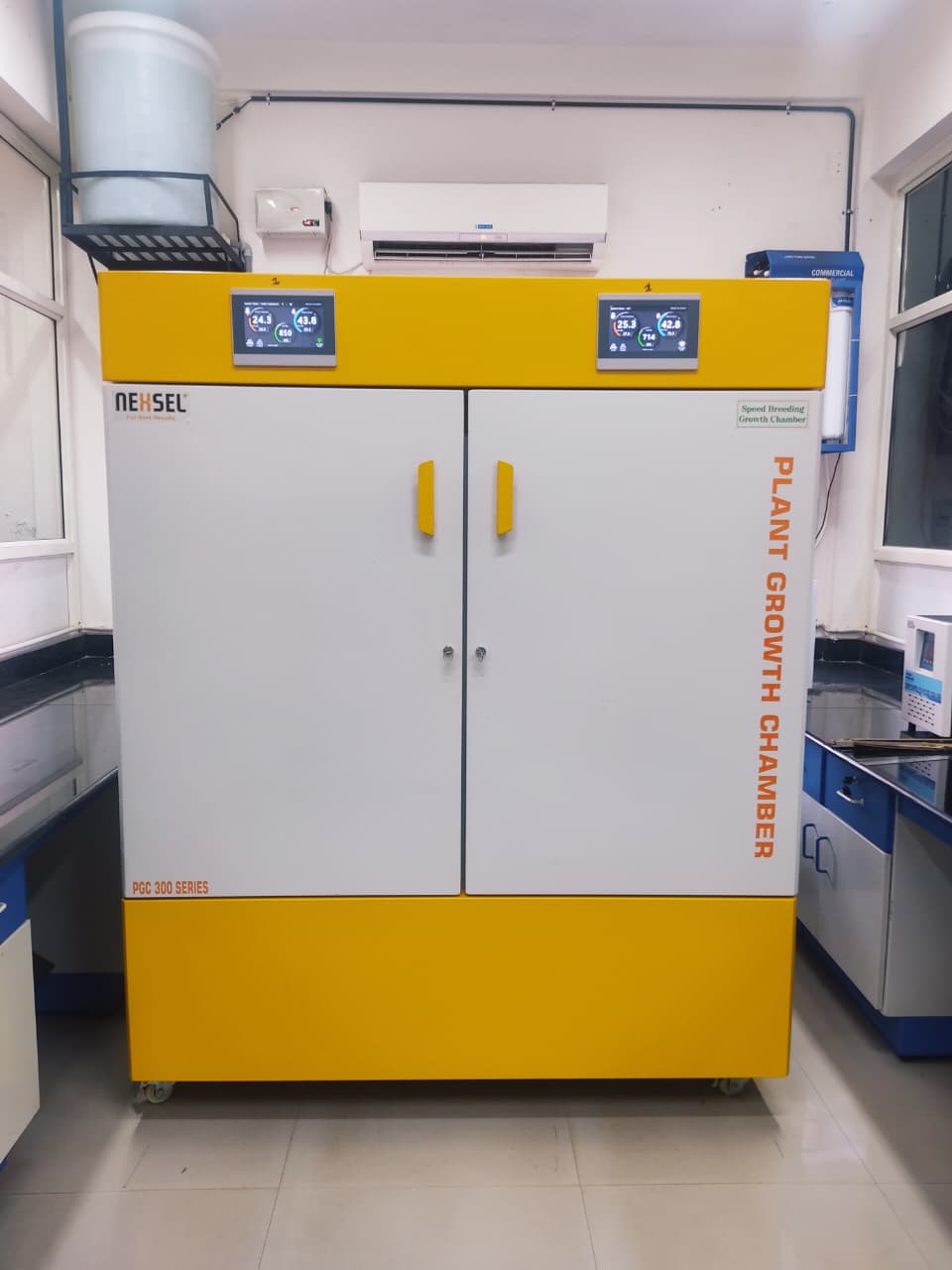 The speed breeding chamber is a custom-engineered, climate-controlled plant growth system designed to enable rapid generation advancement through precise environmental regulation. The unit contains two independent growth compartments, each providing an internal cultivation area of 60 × 120 × 100 cm (L × W × H). Each chamber is equipped with a 400-W all-in-one horticultural LED lighting system, and environmental parameters can be independently modulated via an integrated touch-screen control interface. The system allows the real-time adjustment of atmospheric CO₂ concentration (350–1200 ppm) using dedicated CO₂ injection and monitoring sensors. A wide range of growth conditions can be imposed to optimize developmental rates, including: